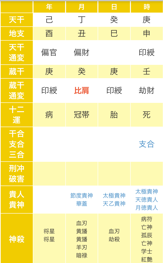 特に蔵干通変星でもっとも大きく運勢に及ぼす場所が月柱の蔵干通変星で運勢を見る上で非常に重要になってきます。ここを別名、月支元命とも呼びます。実際の鑑定でも、ここに本人の性格や特徴が特に良く出やすいのを実感しています。